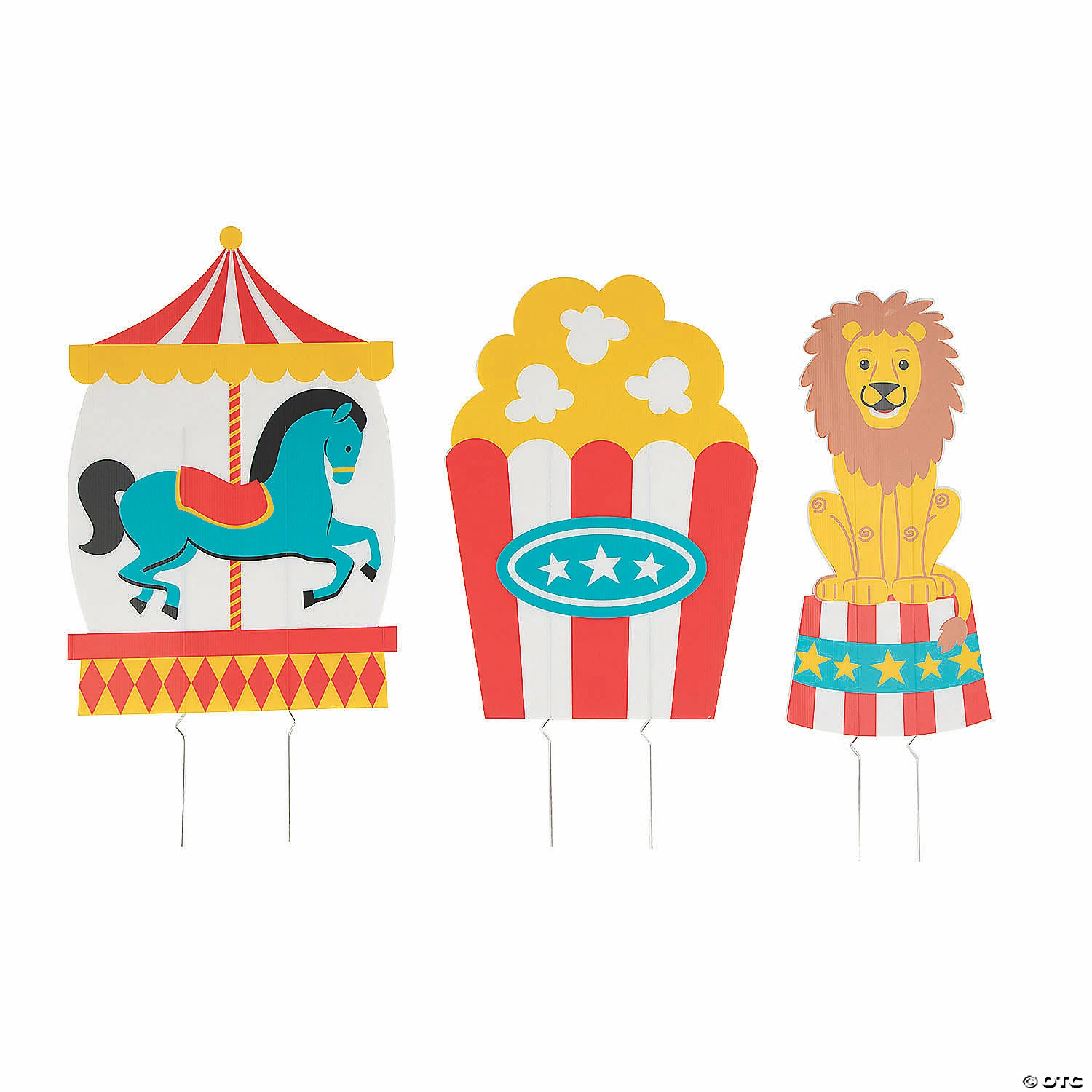 Step right up for some colorful yard signs featuring carnival images! Perfect for displaying outside a carnival-themed birthday party or for a community carnival at a school or church, these signs will help visitors figure out where the gathering is taking place. This set of signs includes images of a carousel horse, a popcorn tub and a lion. Corrugated plastic. (3 pcs. per unit) 10 3/4″ – 16″ x 23″ – 24″ with 22″ metal stakes. Simple assembly required. © OTC