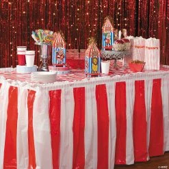 β’ All Occasion Use: Elevate your next event with this classic red and white striped decorative table skirt. It will be a hit at school carnivals, Fourth of July parties, festivals or circus-inspired birthday parties! Includes 1 table skirt.β’ Hide and Shine: Cover up table legs or conceal under-table storage with this table skirt. β’ Construction and Care: This affordable party supply is made of disposable plastic so can be tossed for easy cleanup or reused.β’ Your Party Superstore: We are your one-stop party shop! Come to Oriental Trading for all of your party supply needs, from party decorations to tableware to party favors and more. Product Description: Your table deserves to get dressed up too so pump up the visuals at your next celebration by decorating your table with this red and white striped plastic table skirt. Planning a carnival or circus-themed event? Look for more big top-inspired games and party decor on our site!Specs: Size: 14 feet x 29βQuantity: 1Material: PlasticBrand: Β© OTC – Oriental Trading Company