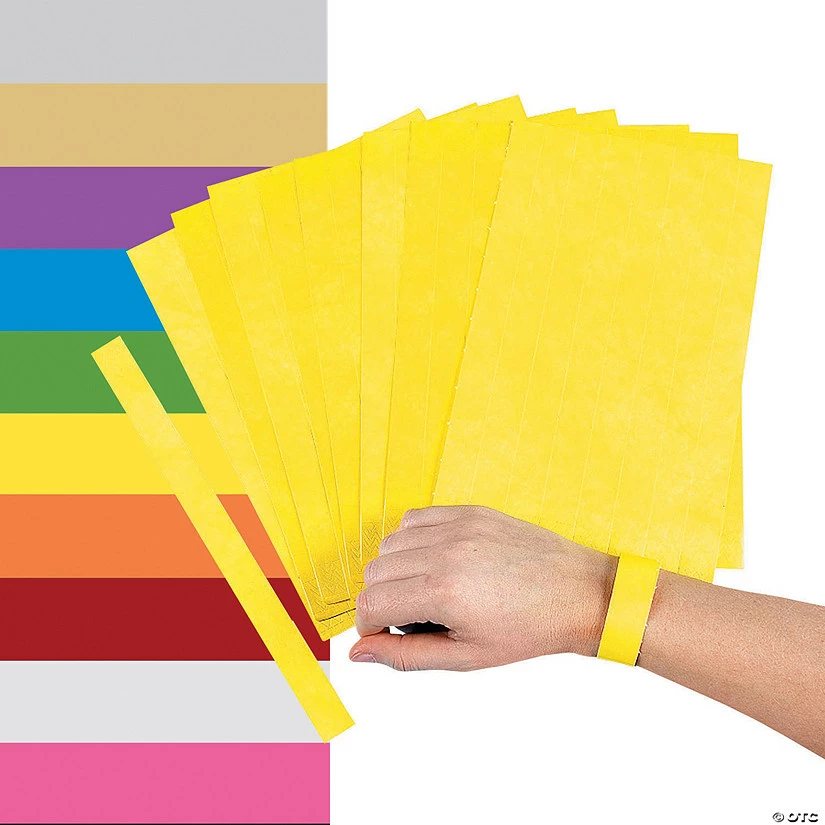 These self-adhesive wristbands are ideal for admission to sporting events, school carnivals, concerts, parties, field trips, proms and public parties. Wear them to help identify your group in a crowd, or use them for re-entry into your event. Includes 10 sheets of perforated paper tickets. (100 tickets per unit) 10″