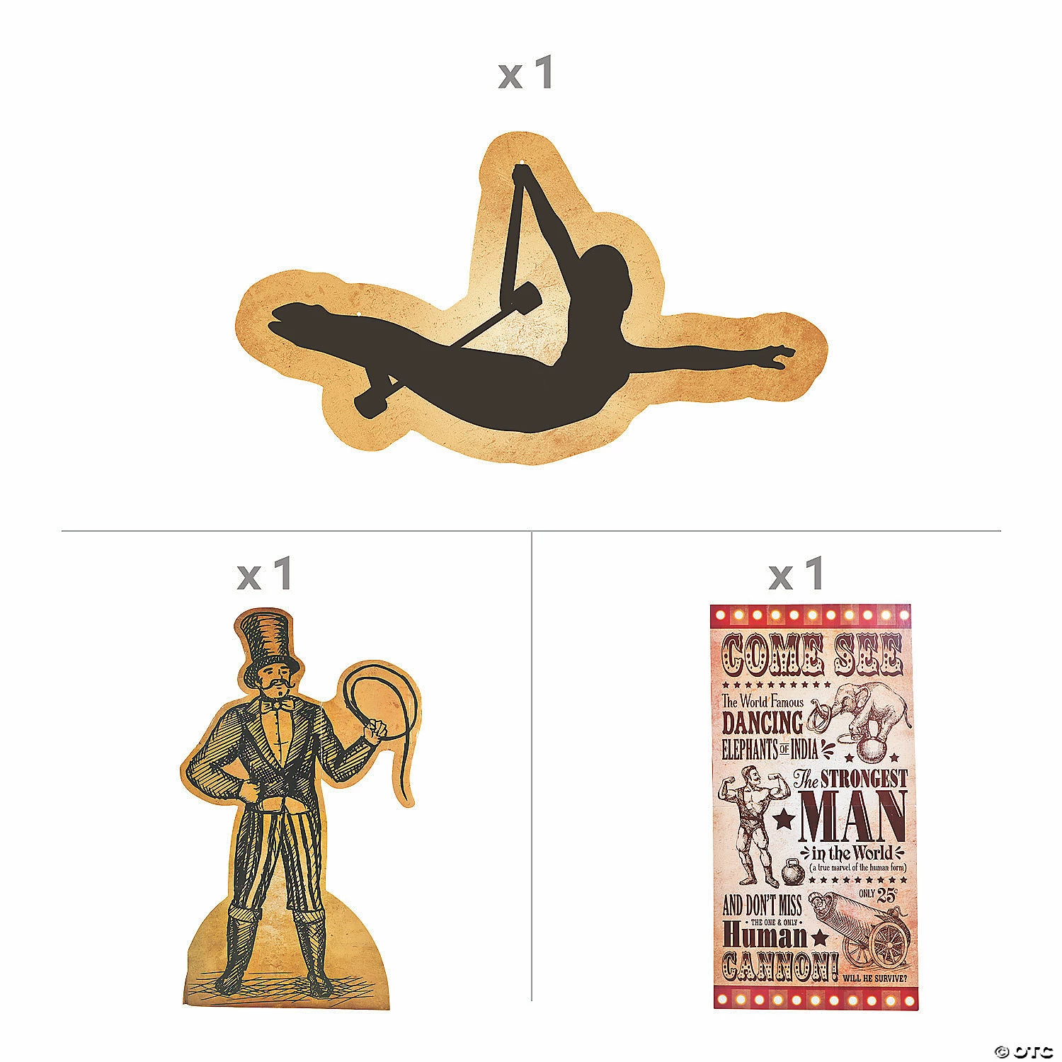 Step right up for the easiest party decorating youβve ever experienced! This complete decorating kit features vintage circus decorations and is great for decorating a circus-themed party or outfitting a fun photo booth or selfie station. An easier option than hiring acrobats to attend your party, this kit makes decorating simple and cost-effective. (5 pcs. per unit) Assortment may vary. Simple assembly required. Stand-ups are one-sided with brown cardboard backs.Includes:β’ 2 Cardboard Vintage Circus Acrobat Hanging Decorations (6 ft. 6-1/2″ x 42″ One-sided with a brown cardboard back.)β’ 1 Cardboard Vintage Circus Performer Stand-Up (54″ x 79 1/2″ Simple assembly required. Stand-ups are one-sided with a brown cardboard back.)β’ 2 Cardboard Vintage Circus Stand-Up Signs (36 1/2″ x 60″ Simple assembly required. Stand-ups are one-sided with a brown cardboard back.)